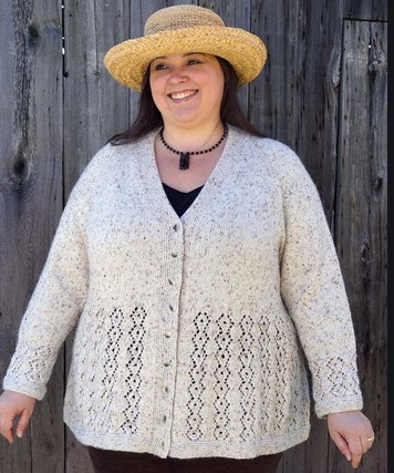 P.S. Thought I’d better add the pattern photo to prevent anyone else’s thinking my project is a bolero ! PLEASE NOTE: I am NOT the same shape/size of this young lady. I’m taller and not much smaller around the bum; but as I said, she’s apple-shaped and I’m pear-shaped. This means she has big tits and I don’t. Alas.
